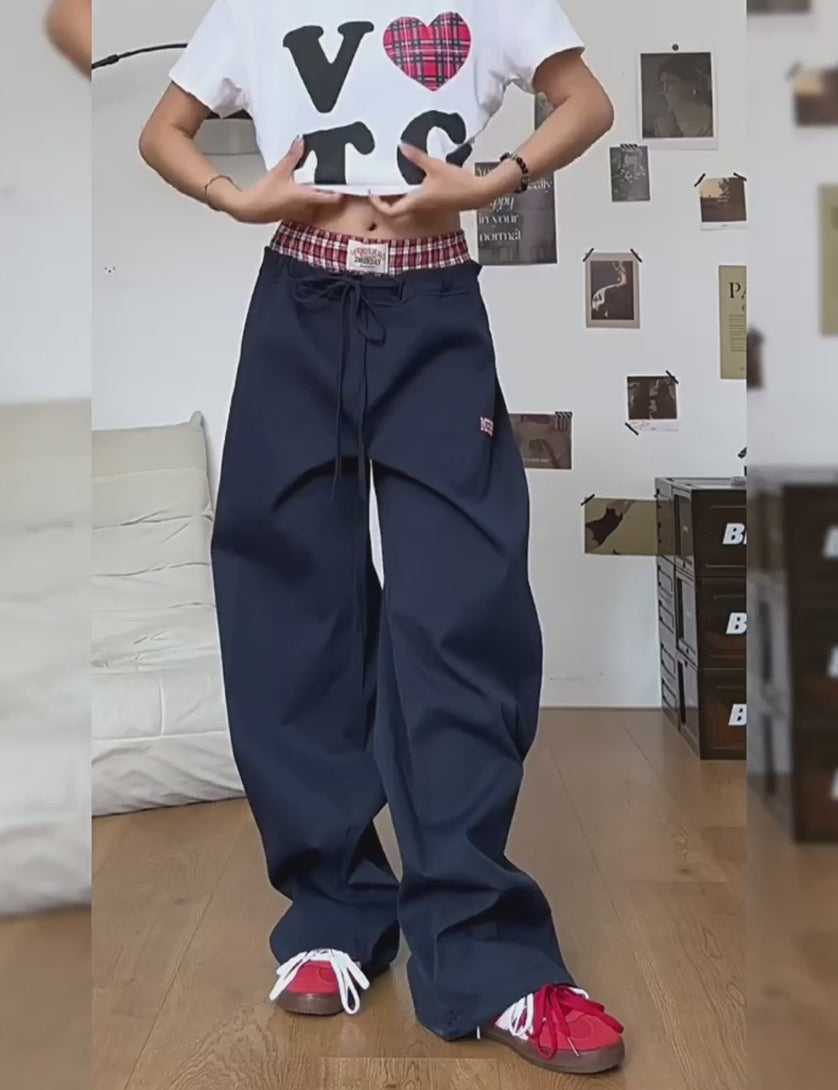 Fullneat Double Waist Plaid Stitch Casual Pants blend unique plaid patchwork with a relaxed fit. Designed as versatile Casual Pants, they bring retro streetwear style and comfort to your daily and off-duty looks.